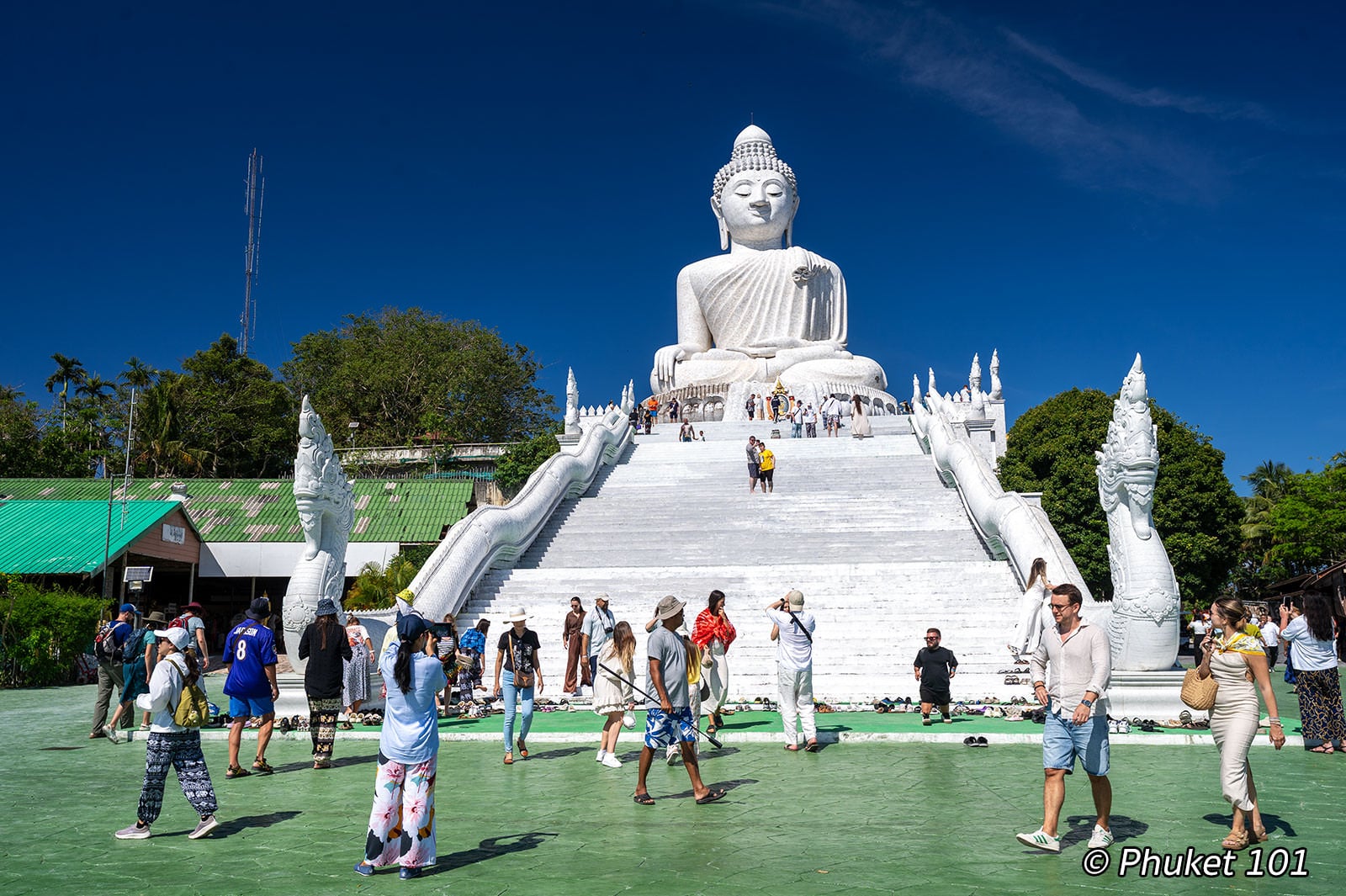 El Gran Buda de Phuket es una estatua de mármol blanco de 45 metros situada en la cima de la colina Nakkerd, visible desde la mayoría de las playas del sur de la isla. Es uno de los monumentos más visitados de Phuket y un lugar de culto activo. Vi cómo lo construían entre 2002 y 2004. En aquel entonces, solo eran andamios y un camino de tierra que ponía a prueba la suspensión y la habilidad al volante, ¡sobre todo en la bajada!
